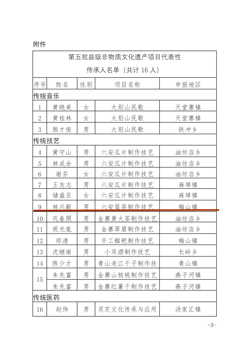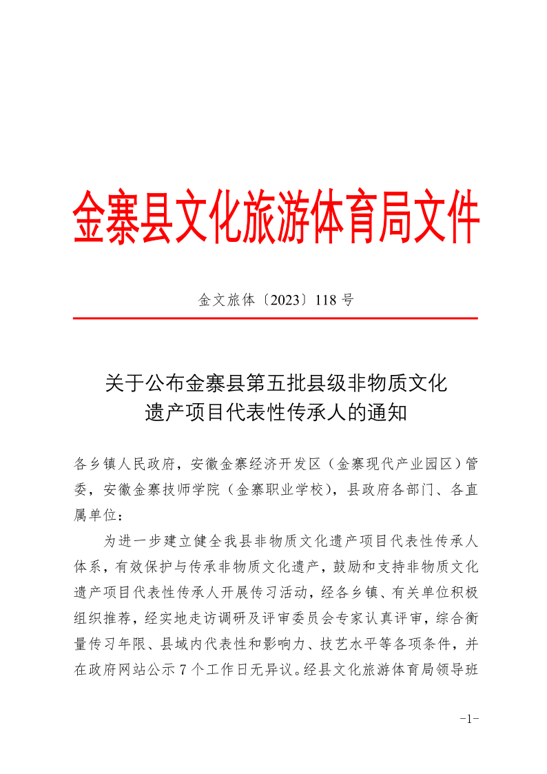 关于公布金寨县第五批县级非物质文化遗产项目代表性传承人的通知