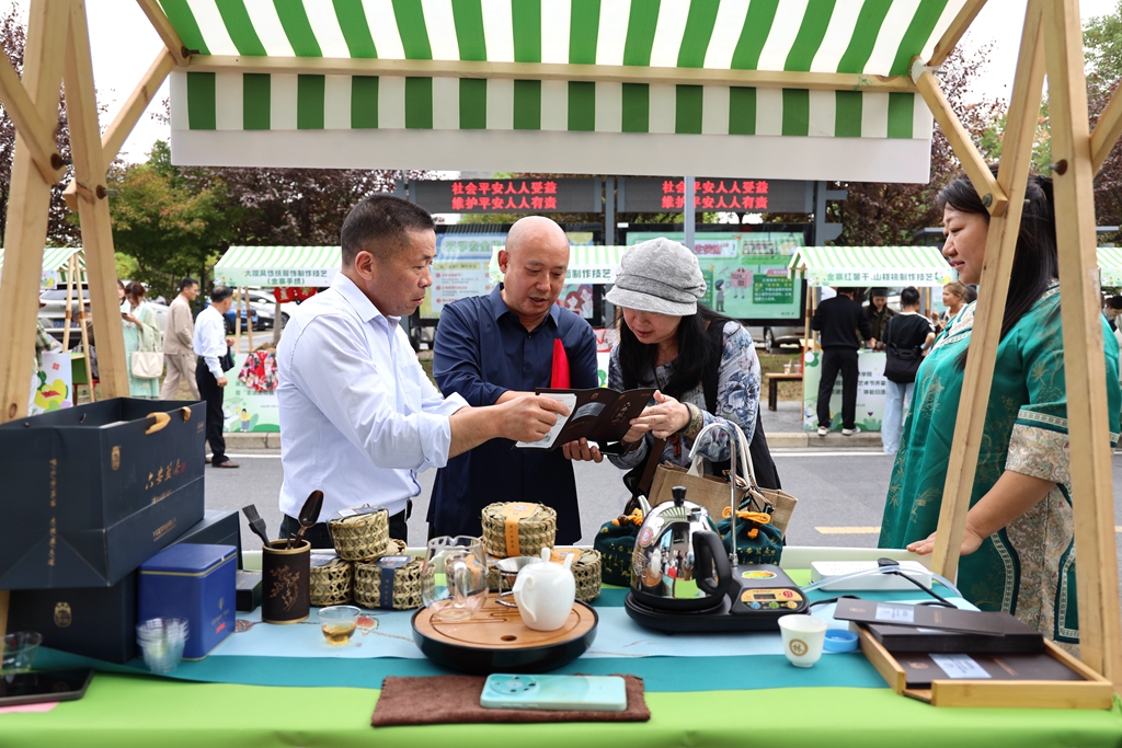 座谈会结束后,樊嘉禄院长、胡迟主任一行,又来到第五届校园艺术节现场,现场观摩了解各个非遗项目的传承与现状,亲口品尝了六安篮茶等非遗项目的产品。