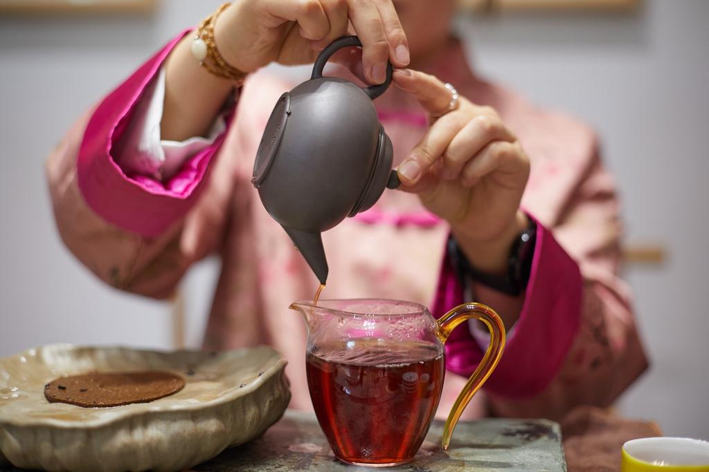 茶馆茶艺师种倩倩为嘉宾们分别冲泡了1996年出口国外六堡老茶、2012年桂青种六堡茶、1998年六堡茶和2021年安徽六安篮茶。整整一个上午,在文化氛围浓厚的中国五星级茶馆里,大家静心品茗,感受茶的魅力,以此来庆祝茶人们自己的节日。
