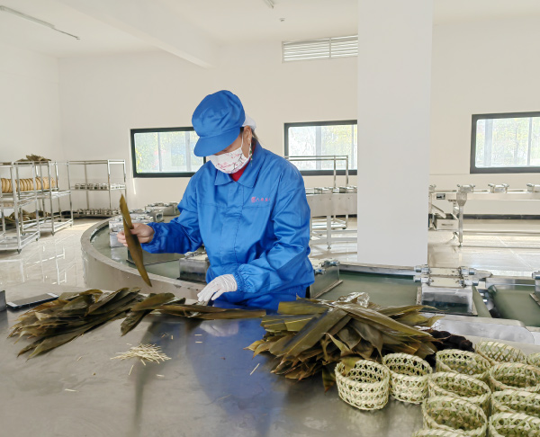 制成后趁热装入内衬有粽叶的圆形竹篓中压实存放。